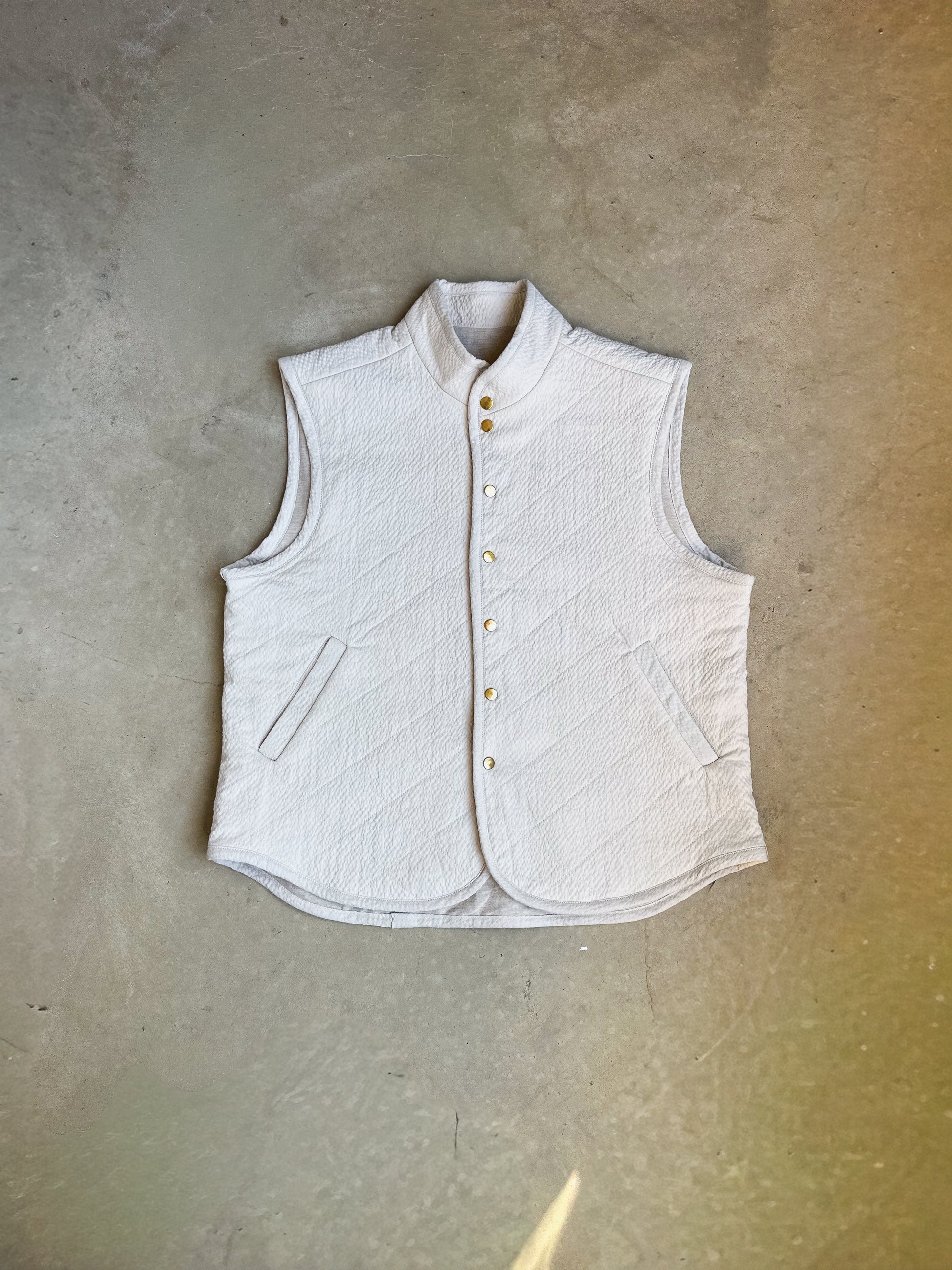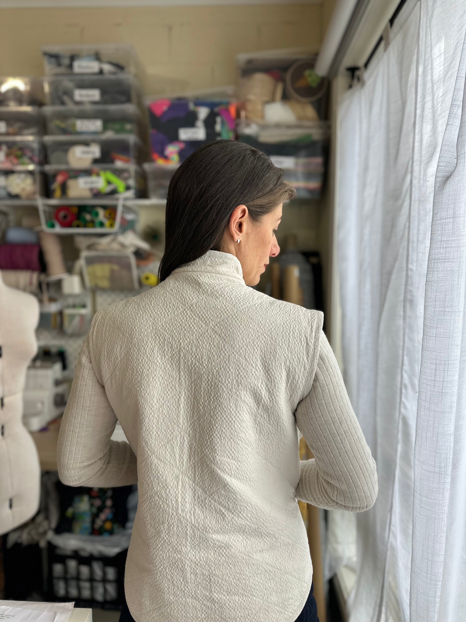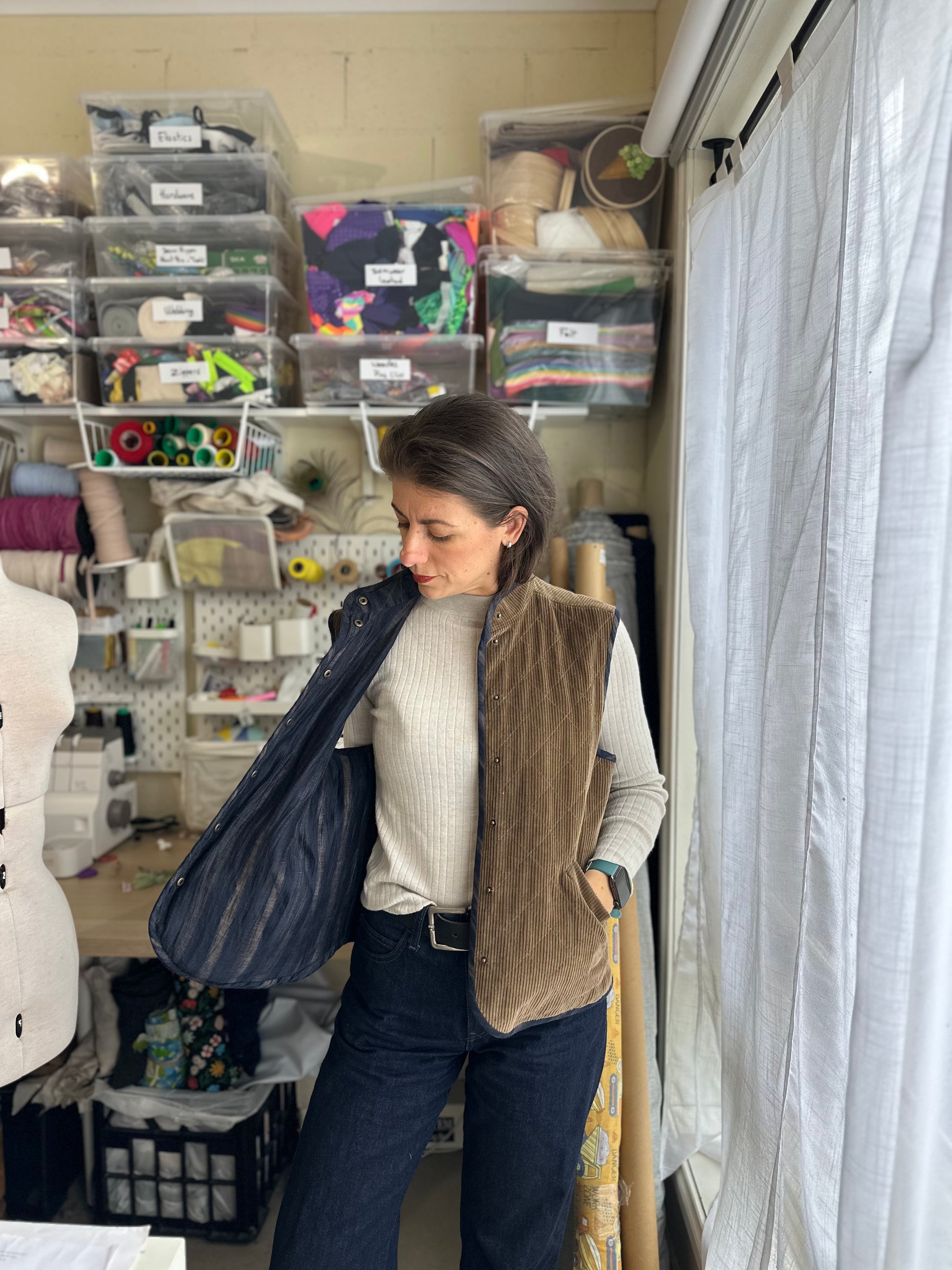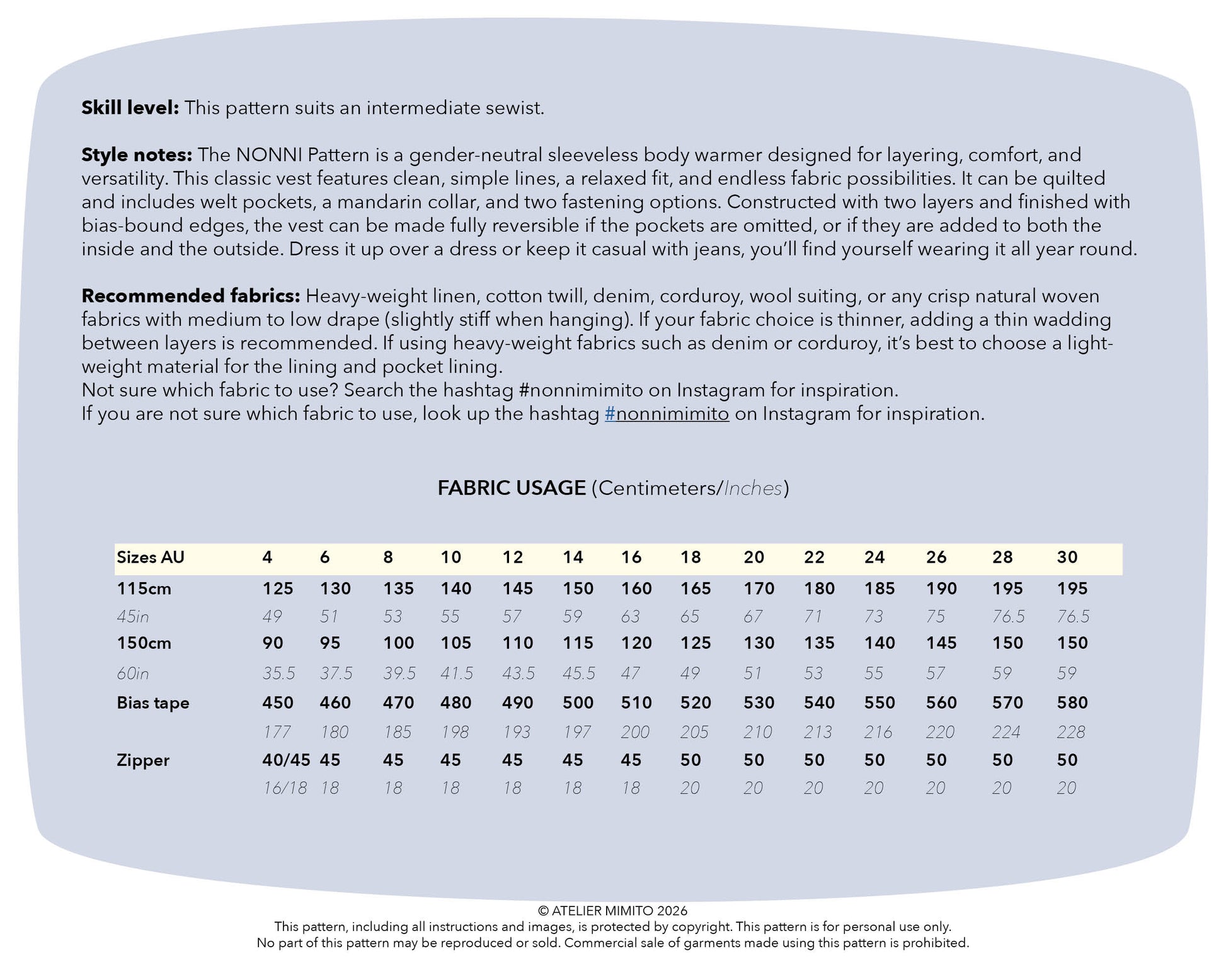 Style notes: The NONNI Pattern is a gender-neutral sleeveless body warmer designed for layering, comfort, and versatility.This classic vest features clean, simple lines, a relaxed fit, and endless fabric possibilities. It can be quilted and includes welt pockets, a mandarin collar, and two fastening options. Constructed with two layers and finished with bias-bound edges, the vest can be made fully reversible if the pockets are omitted, or if they are added to both the inside and the outside. Dress it up over a dress or keep it casual with jeans, you’ll find yourself wearing it all year round.